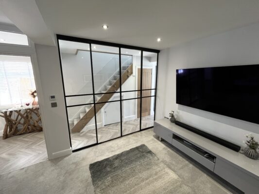 The project required the installation of a 10mm toughened glass door set, with a set of double sliding doors that were fitted with soft closers. The black aluminium glazing channels (RAL 9005) provided a sleek and modern look, while the concealed running gear added to the overall aesthetic of the door set.